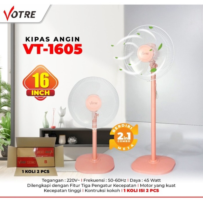 -Ukuran Diameter kipas 16inch -Tombol Tiga pengatur kecepatan -Mesin Motor yang kuat dan tangguh - Putaran Dengan Kecepatan tinggi - menggunakan Konstruki yang kokoh - No Model VT-1605 - Tegangan Daya 220 V - Frekuensi 50-60Hz - Daya 40 Watt