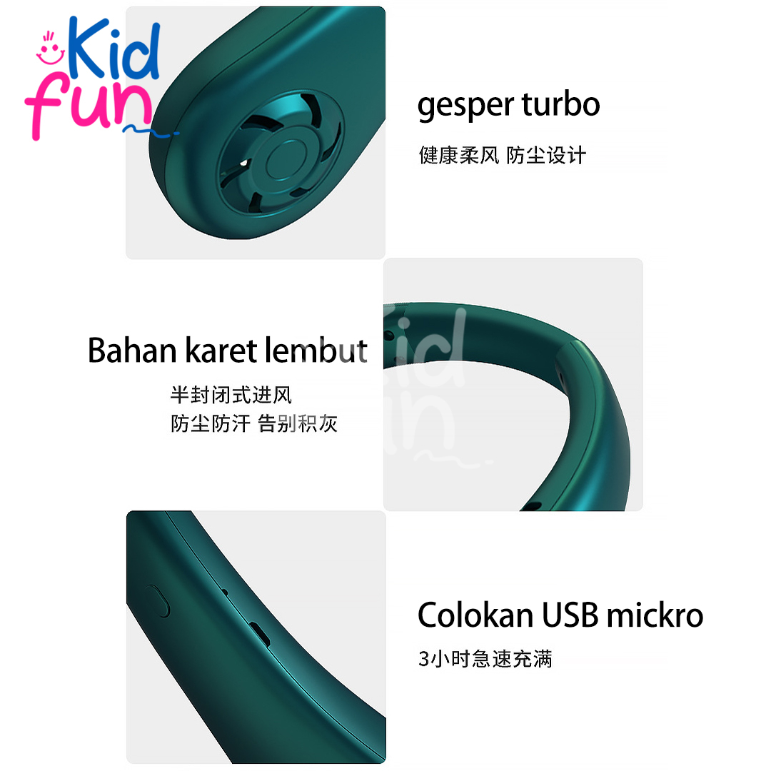 Kipas Leher Tanpa Baling/Kipas Angin Leher Mini/Kipas Leher Gantung Leher Outdoor Aktivitas Olahraga Dengan desain tanpa baling sehingga aman,menghindari mengacak rambut ,melukai penguna dan stylist Rasanya seperti tidak memakai, Desain kipas leher gantung terbaru, Lightness dan Portable kisaran angin yang luas 360°, kehadiranmu tetap mengesankan di setiap sudut, kapan pun dan di mana pun. Cocok untuk pelajar ,pekerja, melakukan pekerjaan rumah tangga 3 tingkat angin: mode 1 : angin yang biasa / angin tidur mode 2 : angin yang mendinginkan angin musim panas mode 3 : angin yang kuat dan kencang yang dapat disesuaikan dengan kebutuhan anda Pengisian daya menggunakan usb charger micro,baterai lithium,baterai tahan lama 2-3 jam