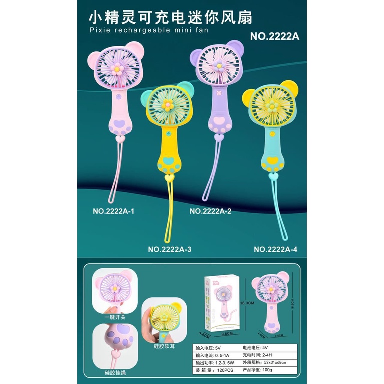Kipas angin mini portable dengan beberapa warna ini memiliki desain yang berbentuk lucu dan unik, sehingga memudahkan Anda menggunakan di tengah perjalanan saat cuaca panas. Kipas portable ini juga memiliki baterai yang bisa diisi ulang (dapat dicharge), dan mampu menghasil angin yang sejuk di saat Anda kegerahan. Didesain dengan kombinasi warna yang unik dan lucu sehingga mampu untuk menambah keceriaan setiap saat.