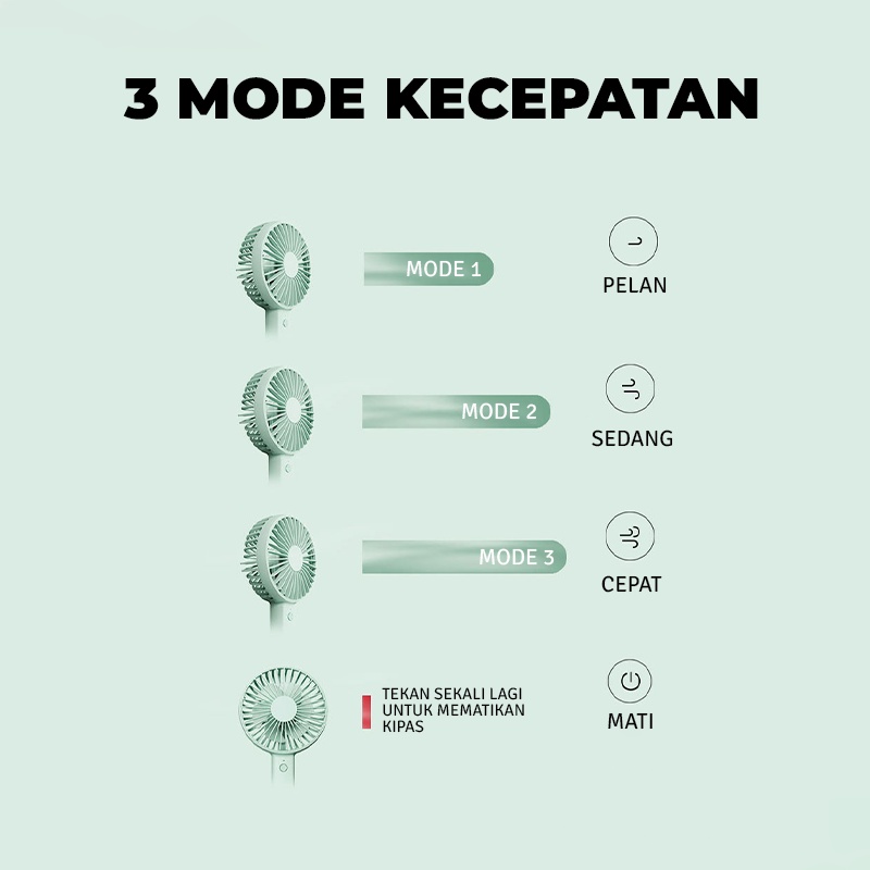 Kipas Angin Tangan Stand Portable / Kipas genggam/Kipas stan Kipas angin portable ini memiliki desain yang simple dan mudah untuk dibawa. Kipas portable ini juga memiliki baterai yOverview of Kipas Angin Genggam Portable dengan Stand ang bisa diisi ulang, pengaturan speed kipas, dan mampu menghasilkan angin yang sejuk di saat Anda kegerahan. Cocok untuk menemani aktifitas Anda di siang hari yang terik. Features Adjustable Fan Speed Anda dapat mengatur kecepatan angin sesuai dengan yang Anda inginkan dengan menggunakan tombol pada bagian gagang kipas. Rechargeable Anda dapat mencharge kembali kipas mini ini ketika baterainya sudah habis dengan menggunakan charger, power bank, dll yang menggunakan koneksi port USB. Strong Wind Kipas ini memiliki kekuatan menghembuskan angin yang tinggi, Anda akan merasakan kesegaran dari kipas ini. Anda juga tidak perlu khawatir akan gangguan suara kipas, karena kipas ini walaupun menghasilkan angin yang kencang tapi tidak menimbulkan suara yang bising. Stand Mode Kipas disertai dengan silicone pada bagian bawah gagang sehingga dapat Anda manfaatkan untuk mendirikan kipas di atas meja, ataupun media datar lainnya ketika Anda lelah menggenggam.