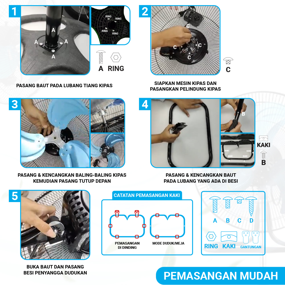 Stabil dan Kokoh Dengan dudukan yang besar, kipas angin ini dapat berdiri dengan tegak, stabil dan tidak mudah terjatuh, untuk selalu menjangkau arah hembusan angin yang lebih tinggi dan luas.