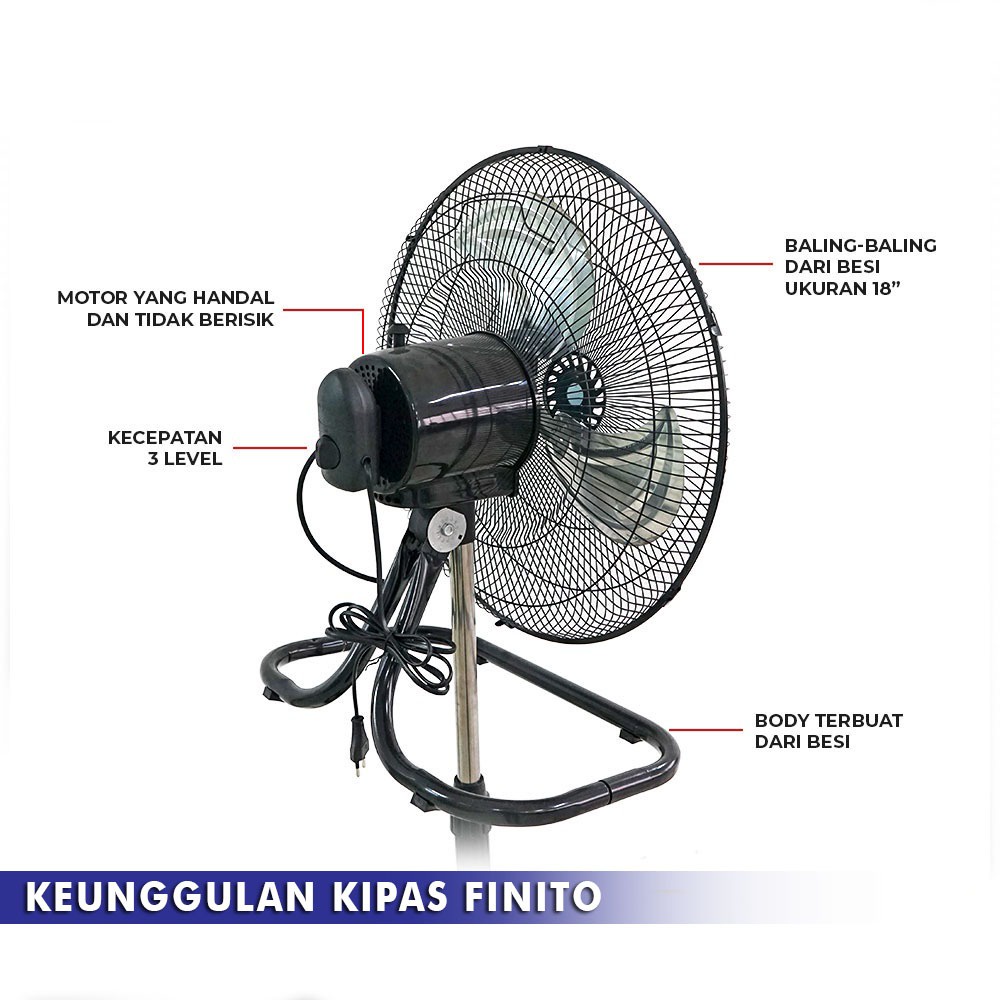 Kelebihan : - Garansi : 1 Tahun - Ukuran Baling-baling 18 Inc Angin kencang - Kabel SNI - Mesin SNI - Motor Awet dan aman dari Konslet - Ada sensor Motor suhu 70 derajat akan mati sendiri - Kawat kipas tebal dan Tidak Mudah berkarat di tempat lain berat kawat 780gr ditempat kami 825gr - Berat tiang di tempat lain 320gr dikami berat tiang 330gr - Baling-baling sudut 12 derajat sehingga angin kencang - Tutup belakang kipas berbahan tebal - Ukuran motor type 71*18 - Lilitan besar sehingga Power mantab karena punya kami berat lilitan 1,145kg ditempat lain hanya 1,1kg. Hal ini membuktikan bahwa kipas finito sangat baik sehingga dapat menghasilkan tekanan angin yang kuat. - Dudukan keras sehingga kokoh dan tidak mudah bergoyang karena dikami berat dudukan 810gr ditempat lain 725gr - motor sangat rapi lilitannya karna menggunakan mesin lilit,