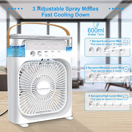 Fitur : * Pendingin ruang pribadi yang memungkinkan Anda memiliki zona nyaman pribadi. * Mendinginkan, melembabkan dan memurnikan untuk udara yang lebih baik. * Hingga 2,5-12 jam waktu pelembab. 600ml) * Kompak & Kuat. * 7 Warna Lampu LED dengan Timer (Cahaya dekat), * Cukup tambahkan air, pasang, dan nyalakan. * Bebas freon, hemat energi