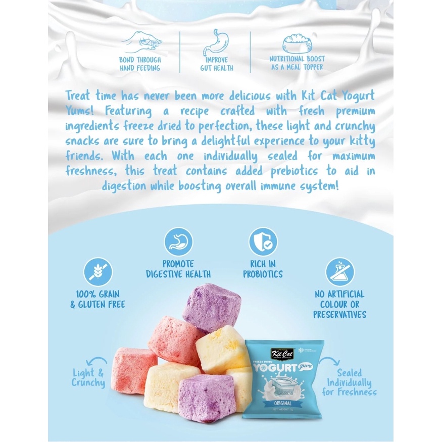 Did you know that a healthy gut is essential for your cat's overall well-being? Proper digestive health helps support a strong immune system, healthy weight, and shiny coat. That's where Kit Cat's Yogurt Yums come in! A satisfying freeze-dried probiotic treats packed with beneficial bacteria, these tasty treats support the balance of good microbes in your cat's gut. Come discover the range and choose from 8 delectable flavours today!