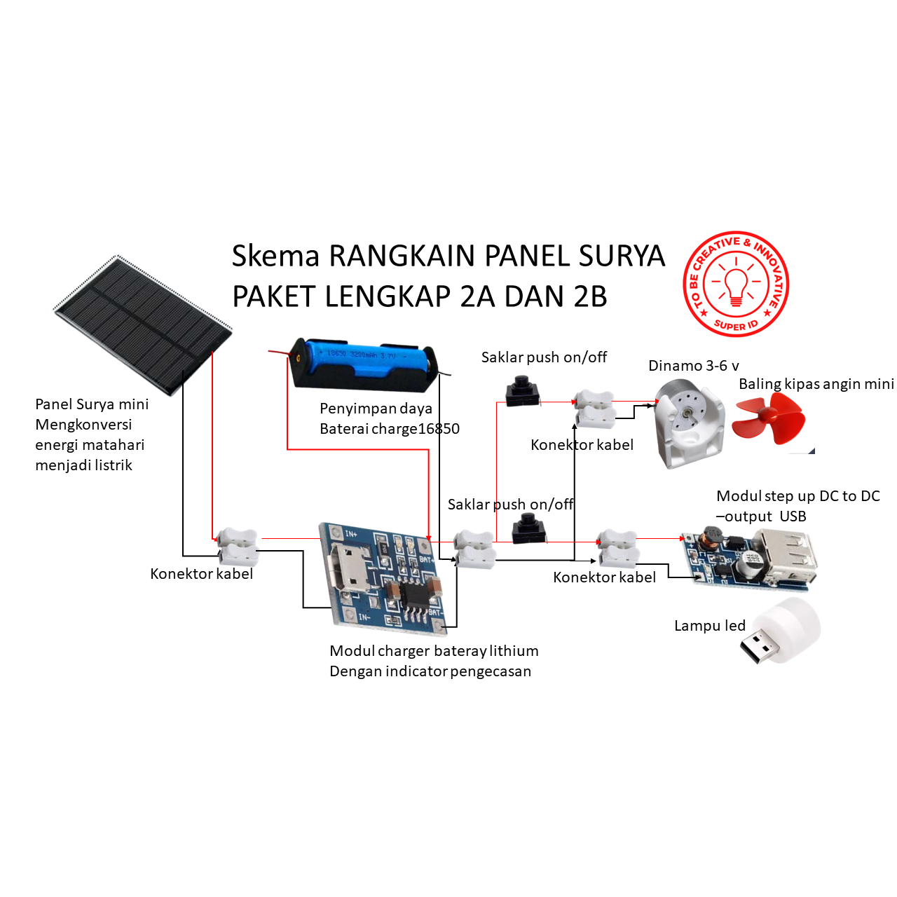 PAKET LENGKAP 2A ( part terpisah/ belum terpasang) PAKET LENGKAP 2B ( instant / sudah terpasang 90 %) - PANEL SURYA termasuk kabel - modul charger baterai lithium/powerbank - modul step up dc to dc usb output - baterai lithium 16850 3400 mah - holder baterai 16850 - dinamo motor dc RF 3000 - 4 pcs quick konektor - 2 pcs saklar push on/off - dudukan dinamo - baling kipas - lampu led usb - papan prakarya - tiang prakarya - kabel awg 26 merah dan hitam (sudah terpasang) - double tape