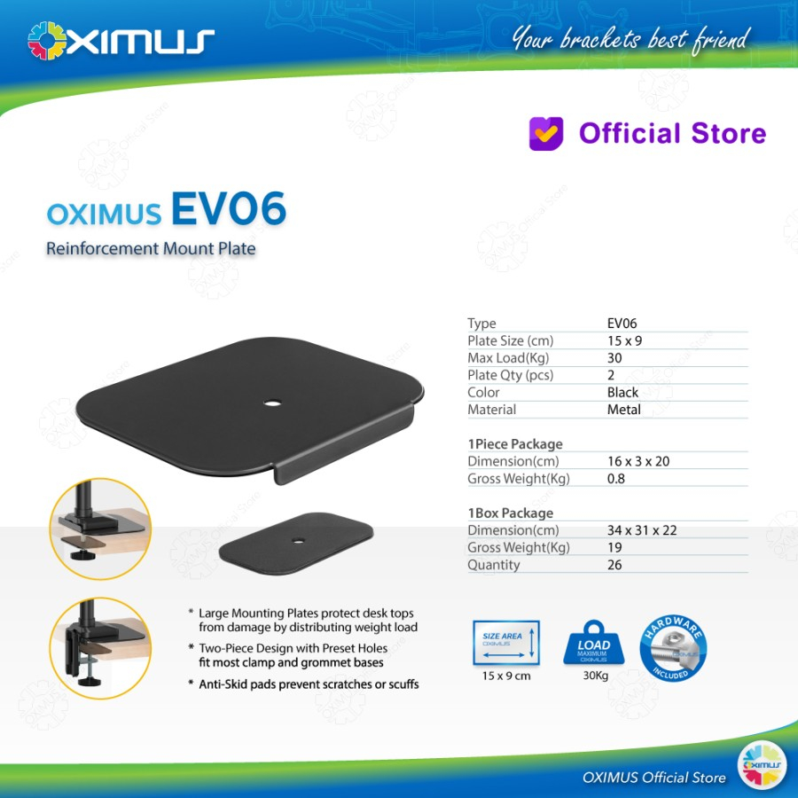 Bagi pengguna yang mengalami ketidakstabilan pada pemasangan lengan monitor mereka, OXIMUS EV06 memberikan solusi yang paling sederhana dan terjangkau untuk instalasi Lengan Monitor yang lebih kokoh, aman, dan terjamin. Plat pemasangan yang besar dan kokoh membagi beban berat sambil melindungi meja dari kerusakan. Desain dua bagian dengan lubang preset memungkinkan pelat untuk bekerja dengan sebagian besar klam atau dasar grommet. Pad anti selip menjamin stabilitas sambil mencegah goresan permukaan. Tersedia dalam warna hitam, putih, dan perak untuk menyesuaikan dengan meja dan lengan monitor yang berbeda.