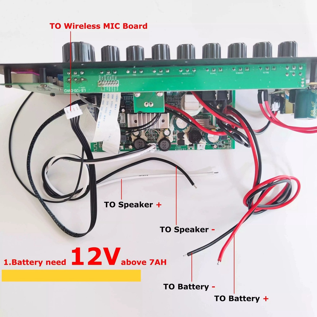 Package includes: 1*Main board 1*Speaker line 1*Battery power line 1*Remote 1*Power cable