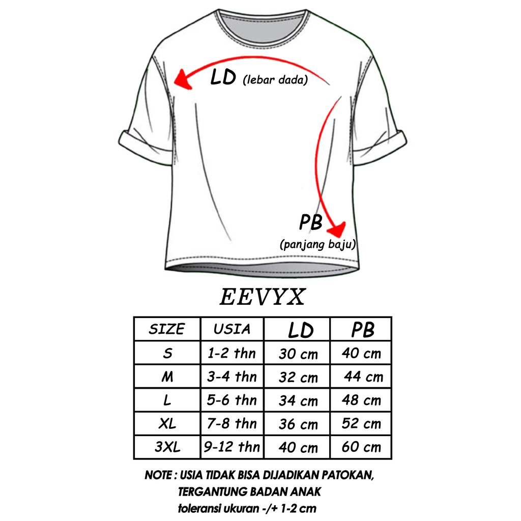 PROMO..!!!Dapat kan potongan harga khusus dengan follow/ikuti toko kami Produksi garmen Jenis bahan katun, adem dan lembut, nyaman di pakai dan tidak panas kualitas terbaik. UKURAN S ,M ,L, XL, 3XL Untuk Anak Usia 1-12 THN Untuk kaos yang memakai sablon, kami memakai sablon PLASTISOL(Raster), awet dan tahan lama serta aman jika diicuci menggunakan mesin cuci dengan suhu tertentu. Lebar dada (LD) Panjang Baju (PB) S=1-2 thn (LD 30, PB 40) M=3-4 thn (LD 32, PB 44) L=5-6 thn (LD 34, PB 48) XL=7-8 thn (LD 36, PB 52) XXXL=9-12 thn (LD 40, PB 60) Toleransi ukuran -/+2cm Harap ukur terlebih dahulu ukuran badan putra dan putri kesayangan anda sebelum membeli MEMBELI BERARTI SETUJU