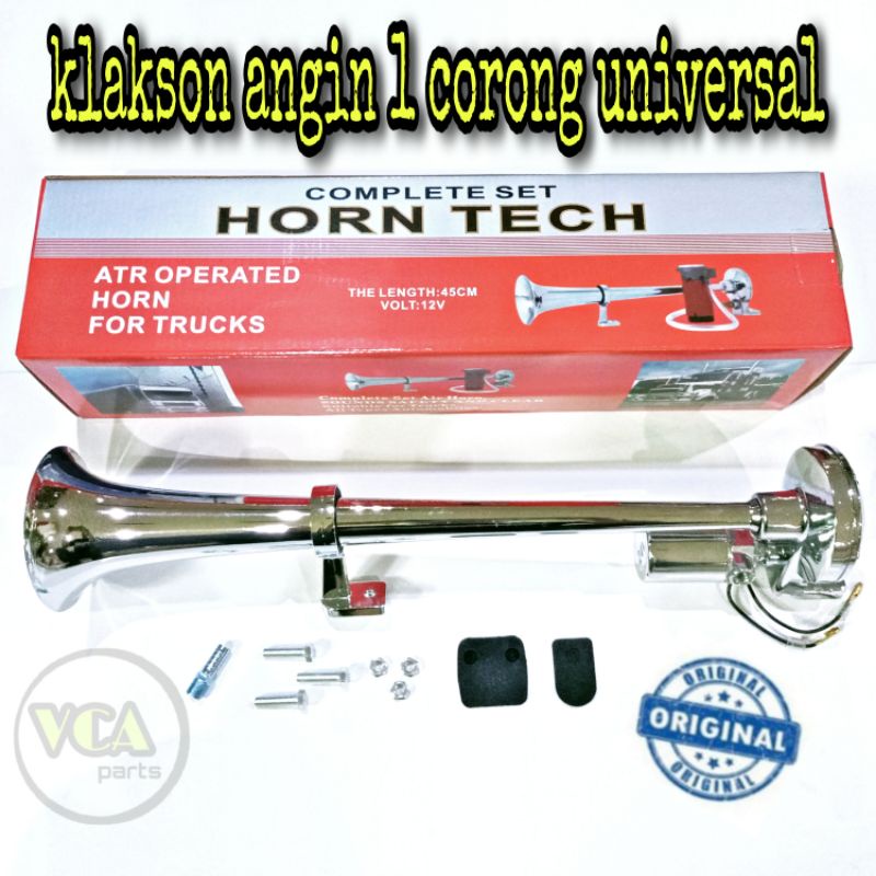 Spesifikasi : produk: klakson1 Corong Panjang Corong : 45 Cm Tegangan : 12 Volt / 24 Volt Aplikasi : Minibus, Truk Dan Alat Berat Kelengkapan : Harus Memerlukan Tabung Angin. kelengkapan : -1 buah corong klakson stainless -1 buah switch klakson angin -2 buah karet tatakan -4 pasang baut dan mur
