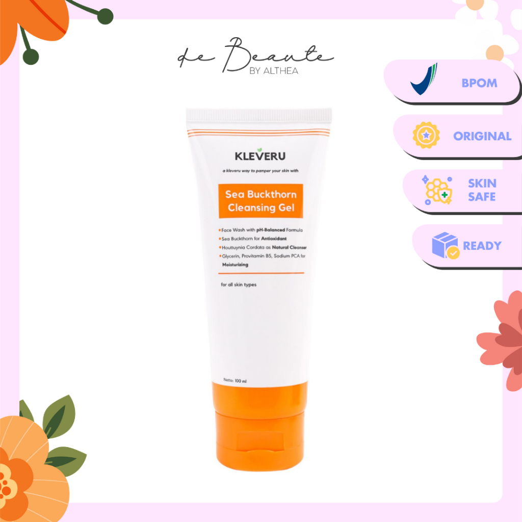 Kleveru Sea Buckthorn Cleansing Gel merupakan pembersih wajah yang diformulasikan sesuai pH kulit alami (5.2-5.5). Berfungsi untuk membersihkan secara sempurna dan mengandung superfruit Sea buckthorn atau dikenal dengan nama Seaberry yang mengandung banyak vitamin dan mencerahkan dengan antioksidan alami tanpa membuat kulit kering dan dehidrasi. Selain itu, juga mempersiapkan kulit untuk tahapan skin care selanjutnya agar produk lebih meresap dan bekerja secara optimal.