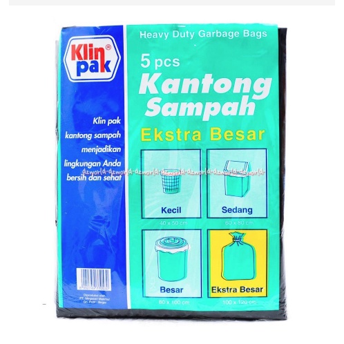 Kantong sampah extra besar.merek Klin Pak kantong sampah, dengan bahan tebal warna Hitam tidak gampang robek, dengan Kualitas terjamin menjadikan lingkungan anda bersih dan sehat.