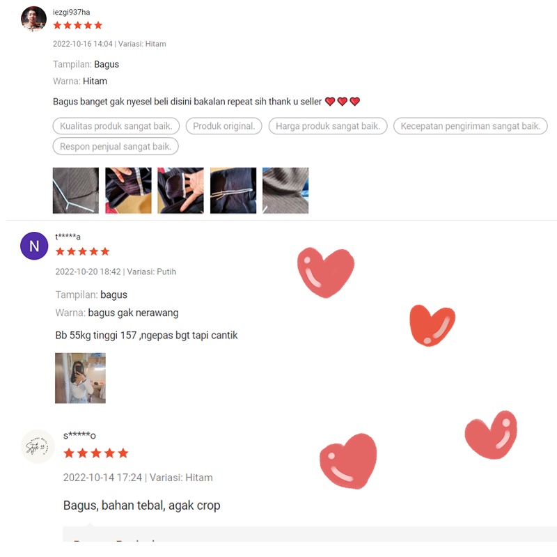 Gudang dan toko kami bersifat lokal sehingga pengiriman akan lebih cepat Produk yang sangat baik dan layanan yang ramah dan respon yang cepat kepada pelanggan Toko kami mengkhususkan diri dalam pakaian wanita modis dan melayani setiap pelanggan dengan sepenuh hati Jangan lupa ikuti akun toko kami untuk notifikasi terbaru saat kami mengunggah item mode baru ️ Ikuti akun toko kami dan berikan peringkat dan ulasan terbaik Anda untuk mendapatkan hadiah dan penawaran menarik