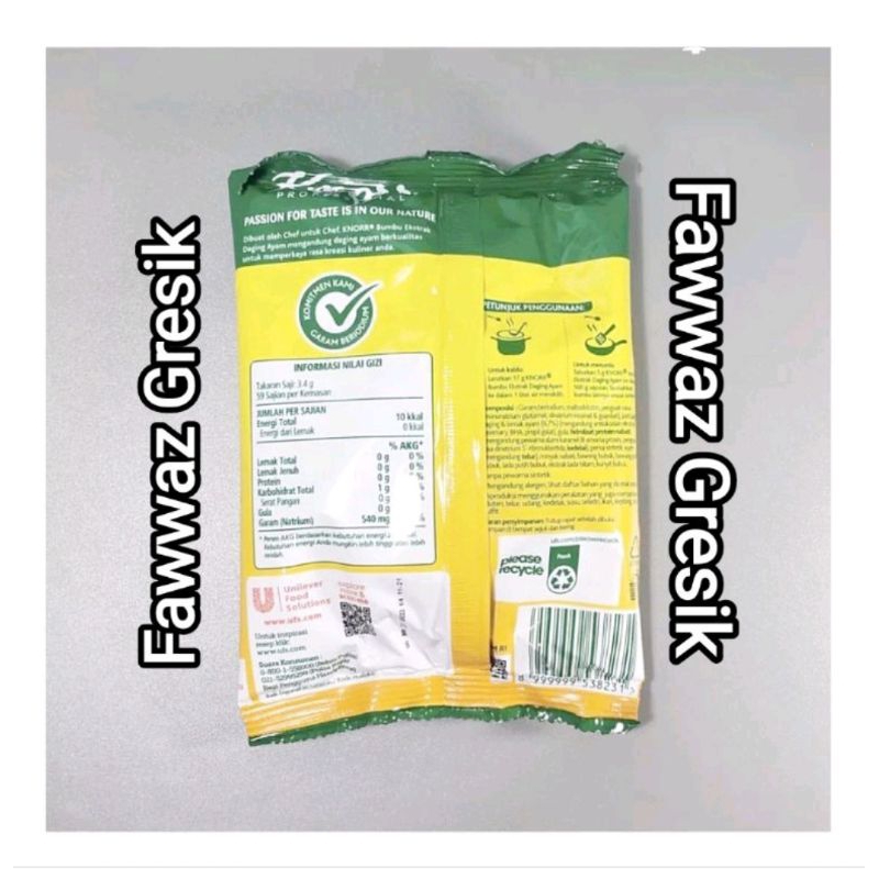 Bahan - bahan Garam, maltodekstrin, penguat rasa (mononatrium glutamat, dinatrium inosinat & guanilat), pati jagung, daging & lemak ayam (8,8%) (mengandung antioksidan BHA, propil galat), gula, hidrolisat protein nabati (mengandung pewarna karamel kelas III, penguat rasa dinatrium 5'-ribonukleotida, kedelai), perisa sintetik ayam (mengandung telur), minyak nabati, bawang bubuk, bawang putih bubuk, lada putih bubuk, ekstrak lada hitam, dan kunyit bubuk.