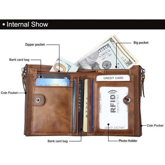 RFID(Radio-frequency itentification): It is a kind of communication technology that can read and write relevant data by radio signals without identifying the mechanical or optical contact between the system. It means that your information will be theft without your consent.Material: Genuine Leather Polyester lining.Dimension: 12.1cm x 9.4cm x 2.7cm / 4.76quot; x 3.7quot; x 1.06quot;Structure: 2 cash pocket, 6 card slots, 1 photo holder, 1 back pocket and 2 zippered coins pockets.Color: Black, Brown and Blue. Spesifikasi Produk Kobwa Cotton Pria RFID Blocking Dompet Kulit Asli Double Ritsleting Lipat Dua Dompet dengan Koin Tempat Kartu-Intl
