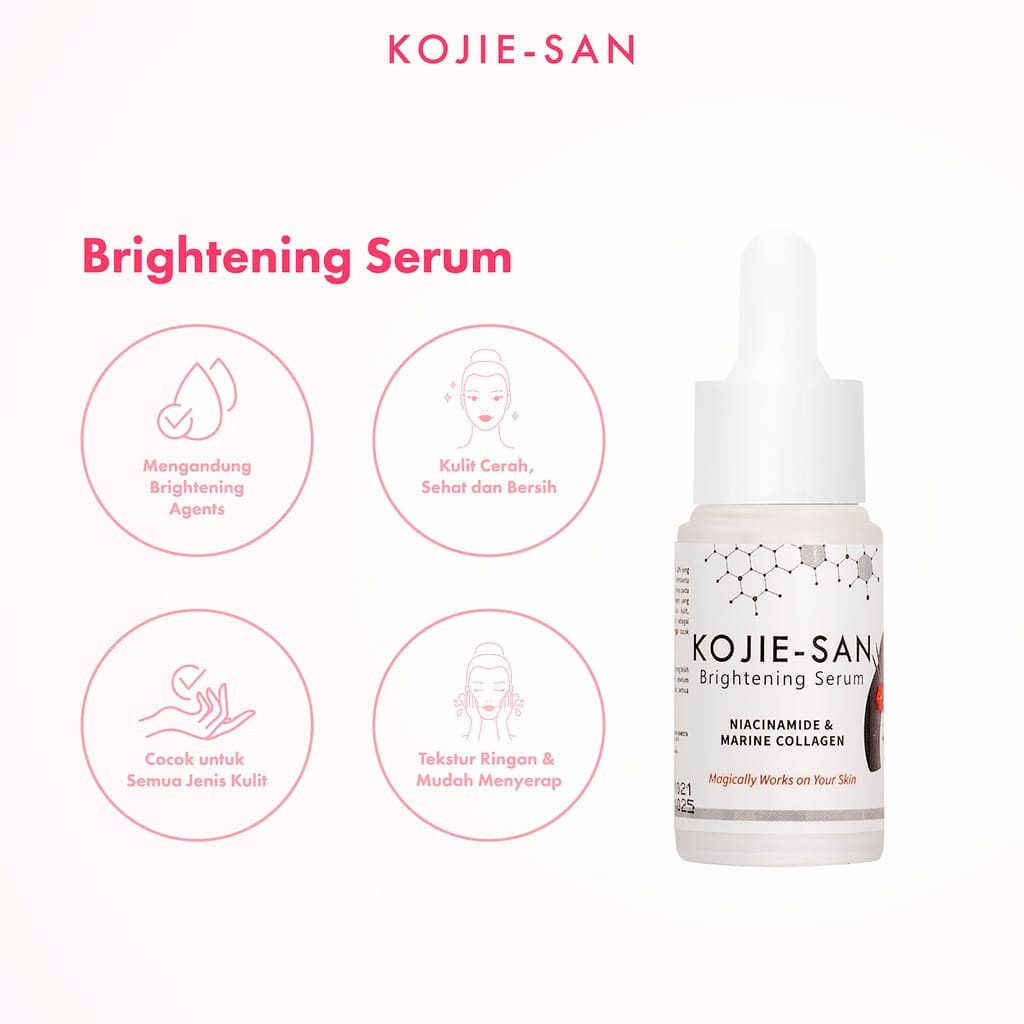 Kojie-San Brightening Serum mengandung Niacinamide yang efektif bekerja sebagai pencerah kulit dan di perkaya dengan Marine Collagen. Dapat di gunakan pada wajah dan cocok untuk semua jenis kulit.