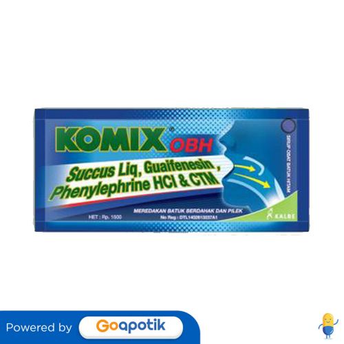 Deskripsi : Komix OBH mengandung Succus Liquiritiae, Guaifenesin, Phenylephrine HCl, dan Chlorpheniramine Maleate yang merupakan obat batuk cair untuk meredakan batuk berdahak & pilek. | Komposisi : Tiap 7 ml mengandung Succus Liquiritiae 167 mg, Guaifenesin 100 mg, Phenylephrine HCl 10 mg, Chlorpheniramine Maleate 2 mg | Dosis : Dewasa: 3 kali sehari 2 sachet. Anak 6-12 tahun : 3 kali sehari 1 sachet. | Indikasi : Digunakan untuk meringankan batuk berdahak dan pilek | Perhatian Khusus : Hati-hati penggunaan pada penderita dengan gangguan fungsi hati dan ginjal, glaukoma, hipertrofi prostat, hipertiroid, dan retensi urin. | Kemasan : Sachet @ 7 ml | NIE : DTL1402813237A1