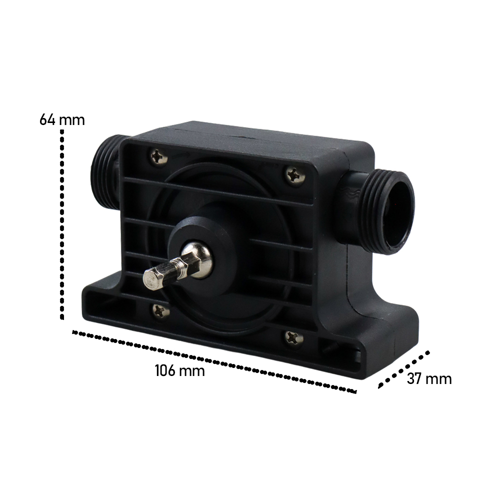 Spesifikasi Material Plastik dan Metal Dimensi Dimensi Bodi: 106 x 37 x 64 mm Diameter Drat Selang: 2.5 cm Diameter Konektor Nozzle Selang: 1.6 cm Diameter Chuck Bor: 7 mm Lain-lain Suhu kerja: 5-49 Derajat Celcius Power Pompa: Hingga 1136 L per jam (Tergantung mesin bor)