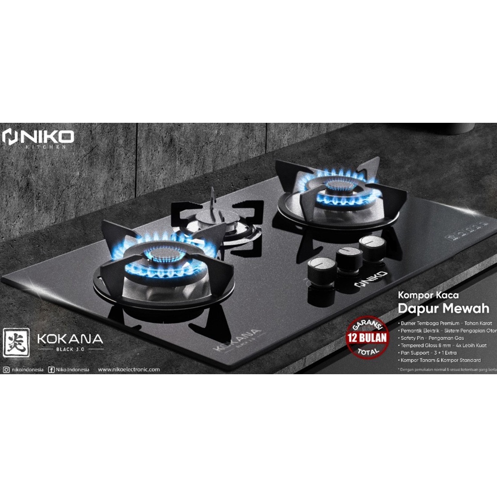 NIKO KOKANA BLACK 2.0 KOMPOR GAS TANAM 2 TUNGKU TEMPERED GLASS-TERBARU