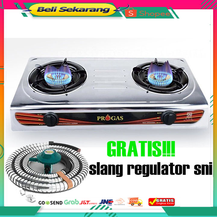 Detail KOMPOR PROGAS 2 TUNGKU+SELANG+REGULATOR API BIRU TEFLON/stenlis 269 api biru MANTAP