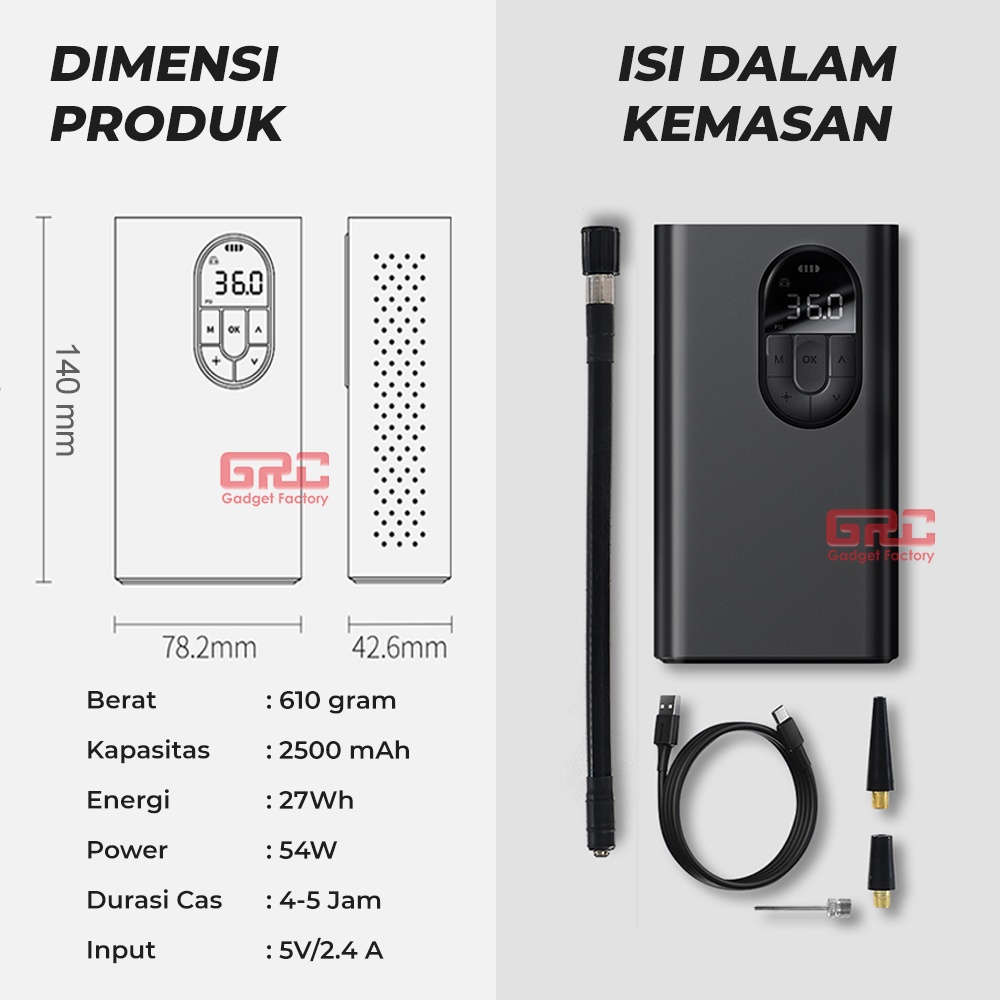 • Nirkabel Cepat Pengisian. Baterai lithium 7500mAh, Pendeteksi otomatis tekanan ban, Pengisian otomatis dan stop, Multi guna