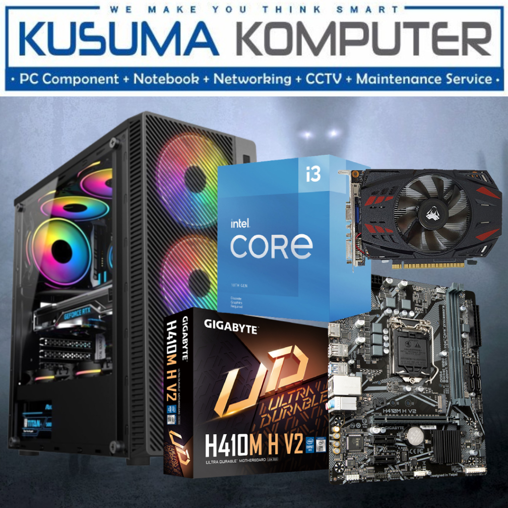 INTEL CORE I3 10105F VENOMRX GTX 750 TI 4GB GDDR5 GIGABYTE H410M H V2 RAM 8GB DDR4 VENOMRX SSD VENOMRX 256GB INFINITY PSU 420W BRONZE AULA GAMING FZ008 WITH 3 FAN RGB
