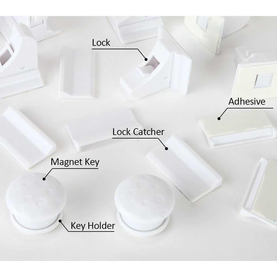 10 Lock 2 Kunci Anda mendapatkan 10 buah lock dan 2 buah kunci. Dengan ini, Anda dapat memasang kunci ini pada banyak lemari.