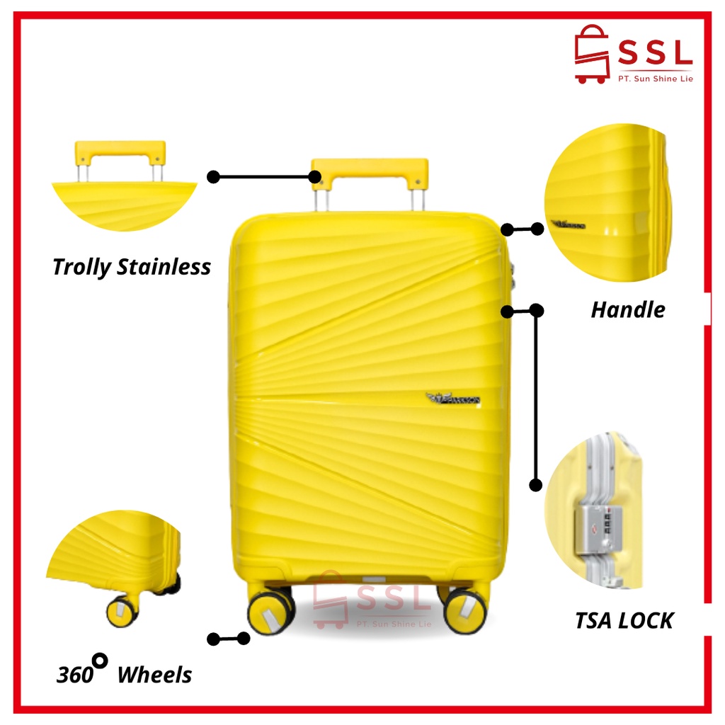 Terbuat dari bahan Polypropylene , koper ini begitu tahan akan guncangan maupun benturan yang tidak diinginkan.Material ini merupakan bahan pembentuk plastik yang mempunyai kekuatan yang lebih baik dibanding material plastik lainnya. Material plastik pada koper ini sangat lentur dan tidak mudah pecah.