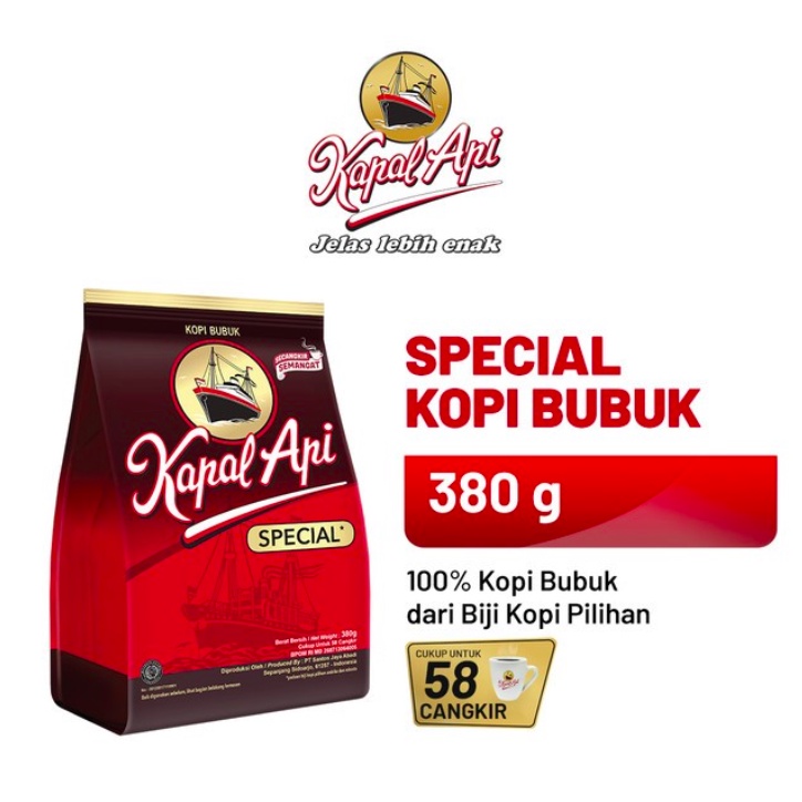 Kopi Kapal Api Special terbuat dari paduan biji kopi berkualitas "Special" menghasilkan aroma dan rasa yang jelas lebih enak, siap memberikan semangat untuk memulai hari. Tersedia dalam kemasan bag 380gr, cukup untuk 58 cangkir.