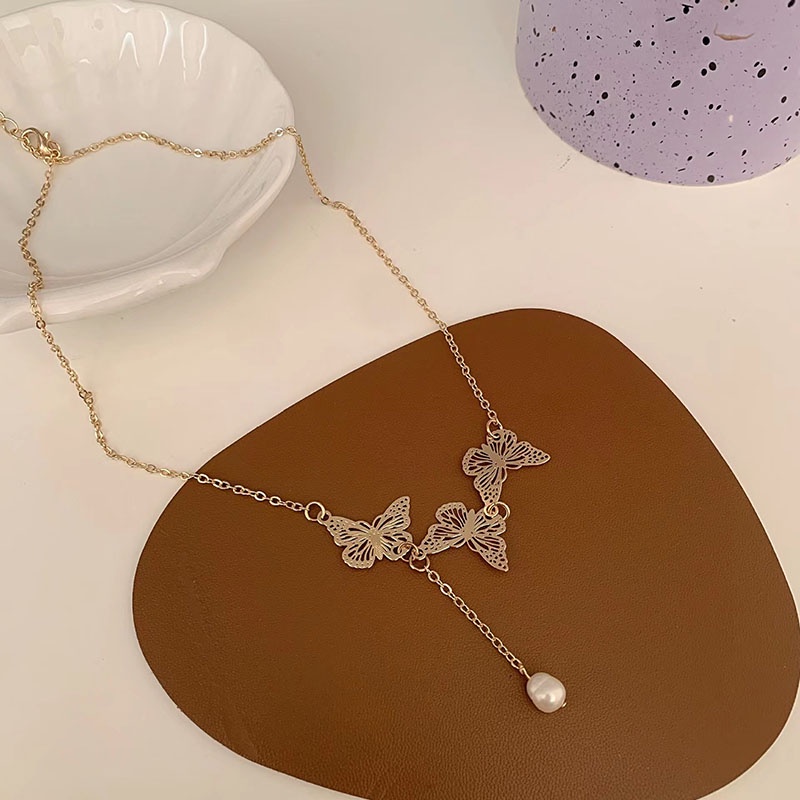 Detail Korea Gaya Baru Sederhana Liontin Mutiara Temperamen Fashion Unik Kalung Kupu-Kupu Berongga