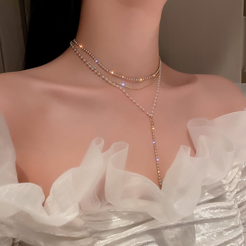 Detail Korea Mutiara Kristal Multi-layer Kalung Sederhana Rumbai Emas Choker Perhiasan Aksesoris