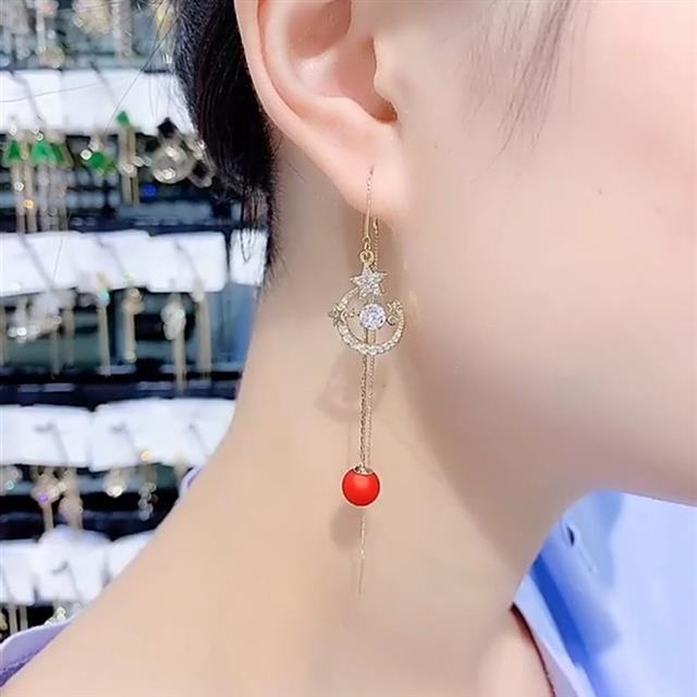 Detail Korea trendi kepribadian fashion red pearl telinga string anting-anting elegan pentagram berlian pan