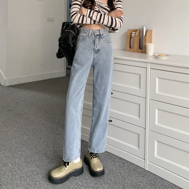 Detail Korean loose straight biru celana jeans kekinian celana jeans panjang wanita