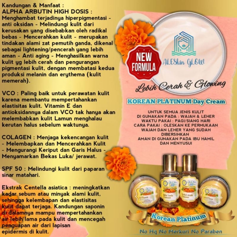 KANDUNGAN ALPHA ARBUTIN HIGH DOSIS, VCO, COLAGEN, AHA, HYCO, SQUALANE, VITAMIN C, dll DI DALAM KOREAN PLATINUM BEKERJA : MENCERAHKAN KULIT MELEMBABKAN MENGHALUSKAN KULIT MENJADIKAN KULIT MENJADI SUPER KENYAL MENINGKATKAN ELASTISITAS KULIT MENGHILANGKAN KERUTAN MENGENCANGKAN KULIT WAJAH