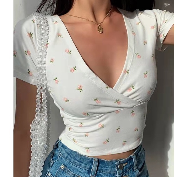 Detail Korean V Neck Short Sleeve Floral Crop Tee Top 2521 (S-L)