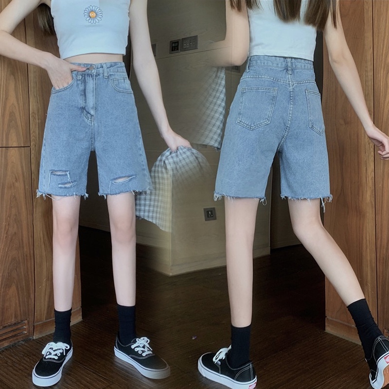 Detail korean style celana pendek denim wanita highwaist premium baggy vintage celana jeans sobek