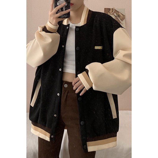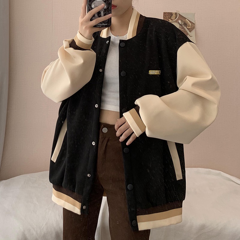 Detail Korean Style jaket baseball oversize Retro outer Crop Kotak-kotak