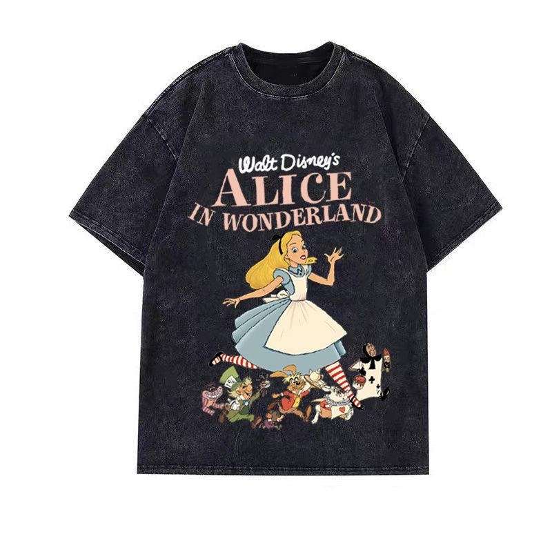 Detail Korean Style Kaos Alice In Wonderland Oversize Washed Sandwash Washing/Vintage T-shirt Hitam Washed Oversize