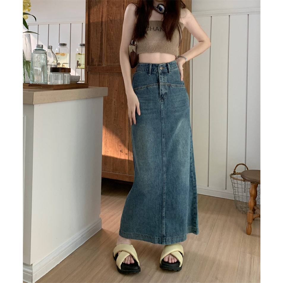 Detail Korean style Rok dres Split a-line skirt Rok panjang denim a-line skirt midi slit