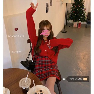 Red Dua setelan jas pesta Tahun Baru posisi C ~ sweter warna solid lengan panjang longgar dengan kancing cinta + rok kotak-kotak merah