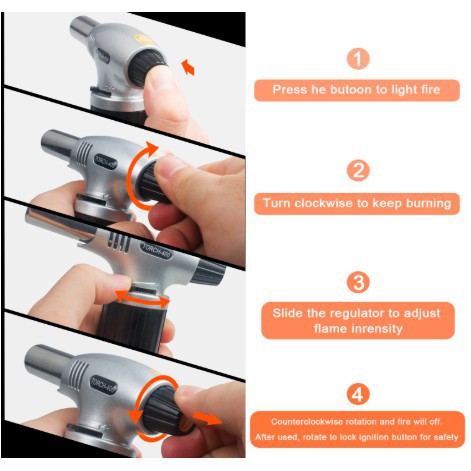 Korek Obor kuliner kualitas profesional: sangat cocok untuk koki keluarga profesional dan kreatif. Hal ini banyak digunakan dalam pengolahan makanan penutup karamel yang lezat, barbekyu daging, cerutu ringan, kerajinan tangan kecil dan sebagainya Obor Kuliner Isi Ulang dan Dapat Disesuaikan - suhu intensitas api dapat mencapai 1300 c / 2500 F untuk memenuhi berbagai kebutuhan Produk ini tidak datang dengan bahan bakar butana, sehingga perlu membeli gas butana 8-10g dengan kapasitas pengisian (bagian bawah produk ini adalah karet yang diimpor, Silakan gunakan gas butana dengan nozzle panjang saja Isi Ulang & Mudah Dioperasikan Isi ulang obor kuliner dengan butana, cukup geser kunci keamanan untuk membuka, lalu tekan tombol, dan nyala api menyala. Manipulasi yang mudah dan tepat. Obor memasak ini dirancang dengan kunci keamanan untuk mencegah operasi yang tidak tepat dan pengapian yang tidak disengaja. Terbuat dari bodi logam paduan aluminium yang tahan lama dan cengkeraman non-selip, untuk penggunaan jangka panjang.