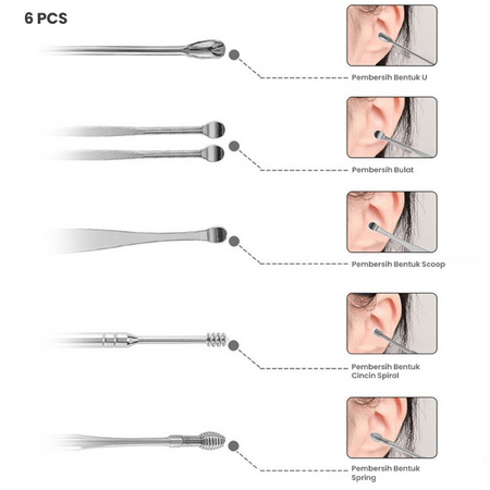 Satu set pembersih telinga ini dapat memenuhi segala kebutuhan Anda dalam merawat dan membersihkan telinga Anda. Dengan bahan stainless steel, korekan kuping ini akan bisa tahan lama. Anda bisa dengan mudah memilih pembersih telinga yang mana yang cocok dengan telinga anda karena dengan berbagai macam bentuknya. Dari kotoran telinga yang keras hingga yang lembek sekali pun bisa dibersihkan