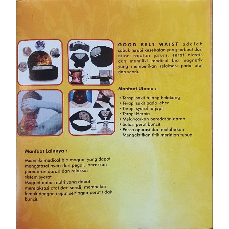 GOOD BELT WAIST adalah sabuk terapi kesehatan yang terbuat dari nilon rajutan jarum, serat elastis dan memiliki medical bio magnetik serta memiliki heating generator yang memberikan relaksasi pada otot dan sendi Manfaat Utama : • Terapi sakit tulang belakang • Terapi sakit pada leher • Terapi syaraf terjepit • Terapi Hernia • Melancarkan peredaran darah Solusi Perut buncit • Pasca operasi atau melahirkan Mengaktifkan titik meridian tubuh