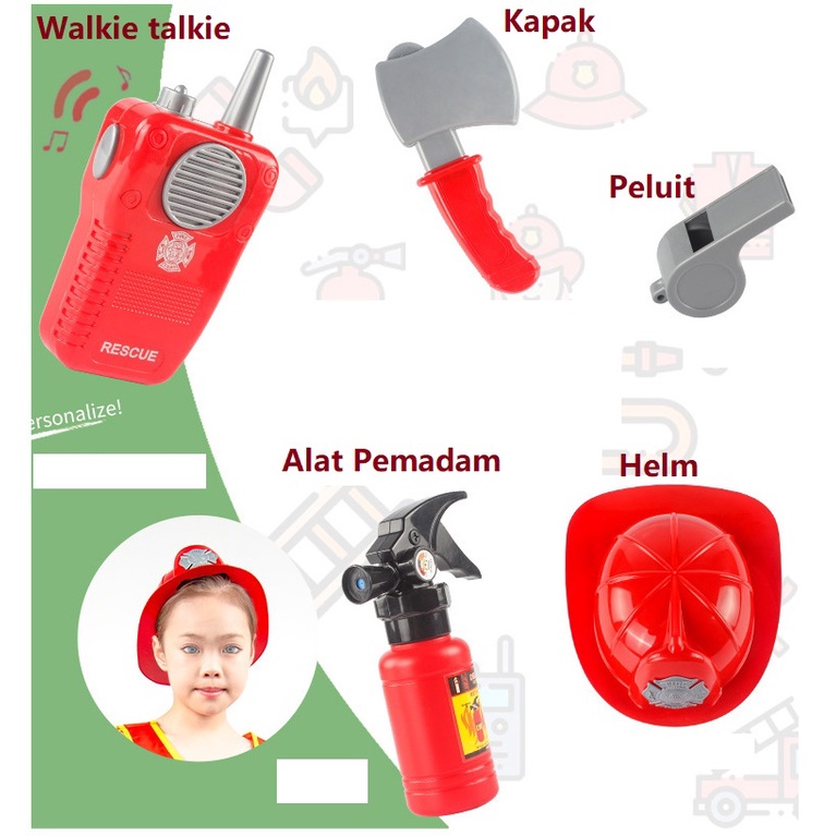 Harga adalah untuk 1 set, terdiri dari 1 Kapak mainan 1 Walkie talkie mainan 1 helm 1 peluit mainan 1 alat pemadam mainan 1 Rompi
