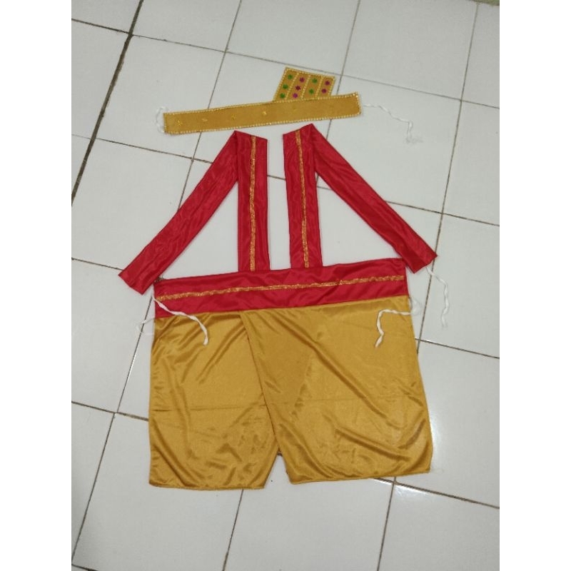 aplikasi tari Saman anak TK dan anak SD. kami membuatnya agar harganya terjangkau. cukup mengenakan mahkota dan kain samping (sudah ada lilit dada). sementara utk baju/celana/jilbab cukup menggunakan seragam sekolah yg ada atau bisa juga baju Koko biasa. bahan : kain emas dan manik2 emas