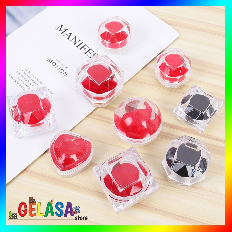Dijual terpisah untuk kotak cincin. Ukuran kotak cincin : * kotak segi 4 : 4 x 4 x 3.5 cm * kotak segi 8 :3,8 x 3,8 x 3,5 cm * kotak hati : 4 x 4,4 x 3 cm * kotak bola : diameter 5,5 cm * kotak double : 6,4 x 4,5 x 4,5 cm