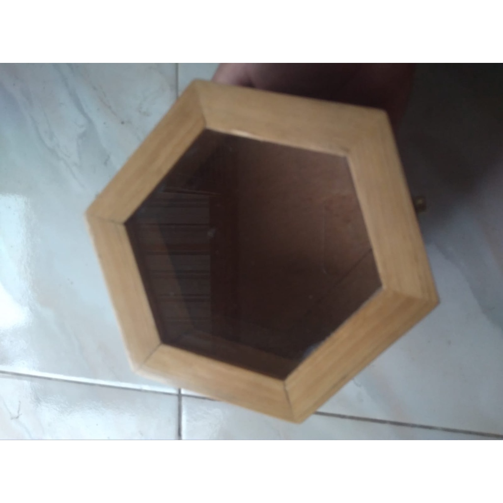 ring box berbentuk heksagonal segi enam terbuat dari bahan kayu pinus. Tutupnya kaca. Ukuran diameter sekitar 14 cm (cek foto) Bisa digunakan untuk membuat moment pernikahan anda semakin berkesan