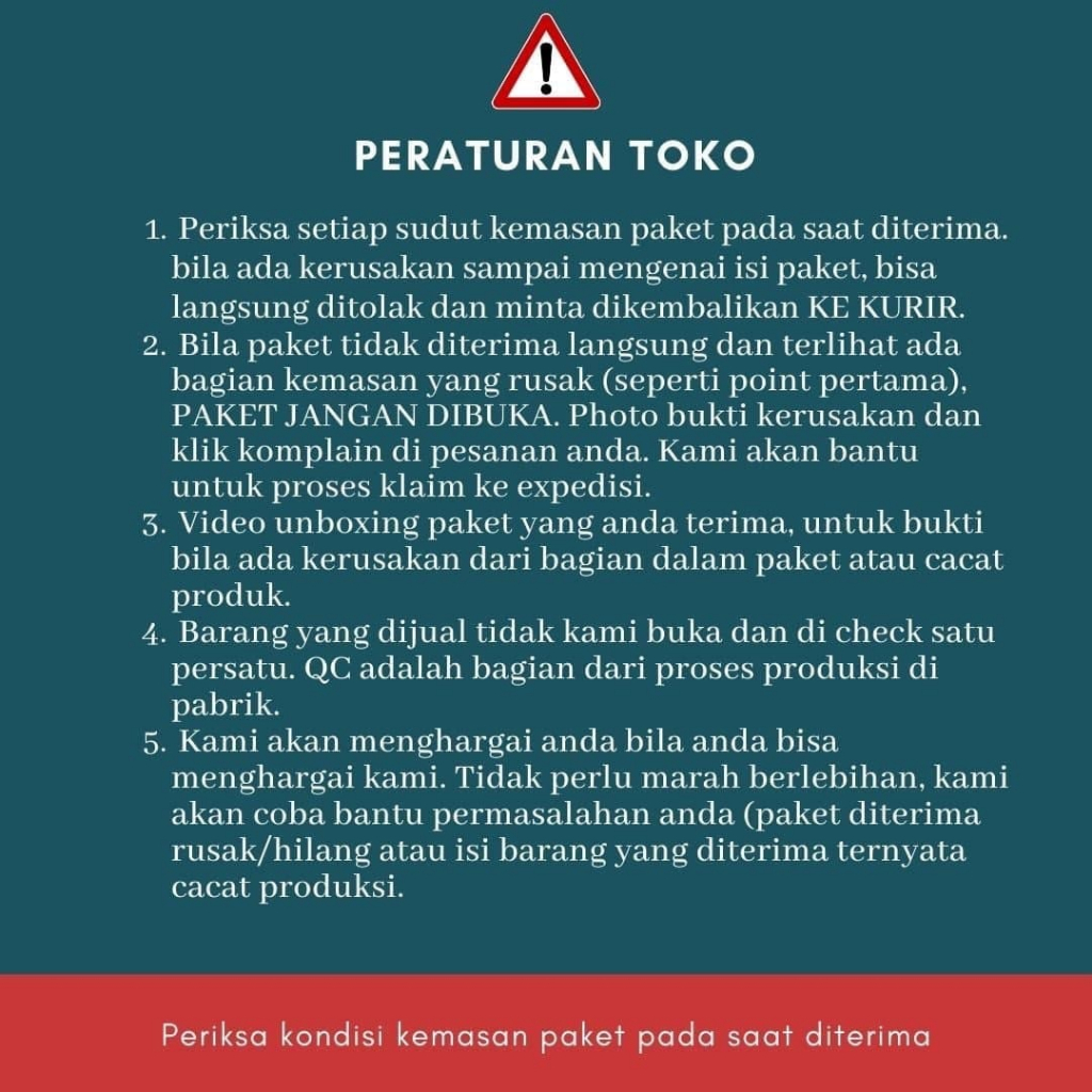 Semua barang yang kami kirim sudah melalui proses cek dan dipastikan dalam kondisi BAGUS/BAIK. Kami Menyarankan membeli tambahan packing bubblewrap ntuk membantu melindungi produk dari hal-hal yang tidak diinginkan. Kerusakan yang disebabkan oleh pihak kurir atau tanpa tambahan packing bukan menjadi tanggung jawab kami. Dengan MEMBELI berarti setuju dan mengerti dengan ketentuan tersebut.