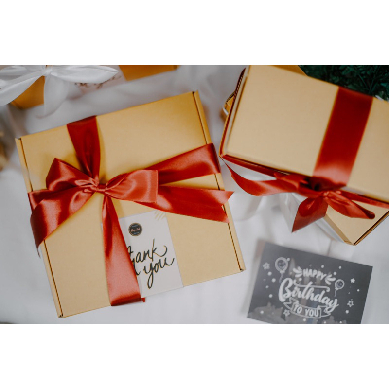 Harga yang tertera terdiri dari : - Box Kardus Coklat bahan E-Flaut (kokoh tidak mudah penyok) - Pita (Bisa Request Warna) - Stiker Segel / Label - Shredded Paper / Kertas Cacah - Greeting card (Free Request Tulisan)