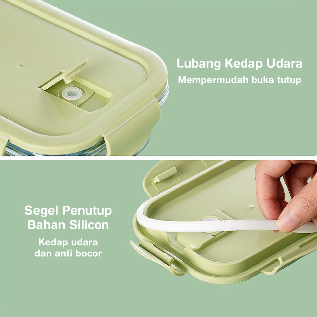 LUNCHBOX KACA TAHAN PANAS - Bahan kaca tebal dapat dipanaskan di microwave & oven (Tahan panas hingga 200ºC ) - Dapat disimpan dalam kulkas dan freezer (Tahan dingin hingga -20ºC) - Segel ganda lock dan silikon menutup dengan erat anti bocor dan kedap udara. - Desain unik dengan 3 pilihan warna (BIRU, HIJAU, PINK). - Tersedia juga varian 2 kolom dan 3 kolom (Ukuran Large 1040ml). - Bahan kotak kaca dan tutup plastik PP berkualitas FOODGRADE (Aman untuk makanan). - Lobang udara pada tutup fungsi mempermudah buka tutup.
