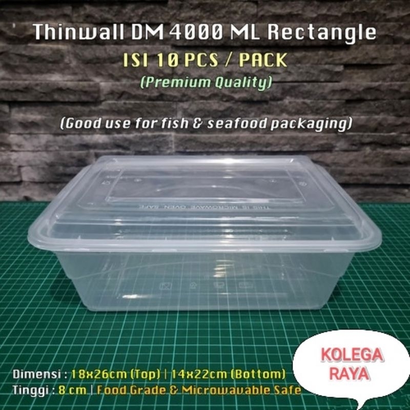 ^Harga untuk 10 pcs thinwall set alas + tutup ^Uk : Kapasitas isi/volume 4000ml P x L x T 32cm x 22cm x 11cm ^Ketebalan 0,5mm ^Bisa microwave dan freezer ^Bahan PP Foodgrade (Aman digunakan untuk bahan makanan apapun) ^Cocok untuk tempat makanan seafood, nasi dan lauk pauk, catering, salad dll.